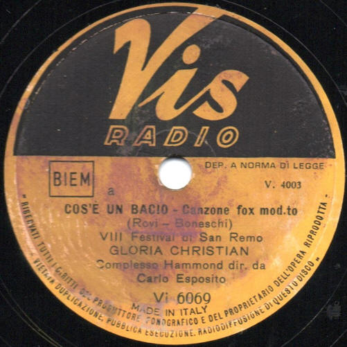 Da supporto 78 giri VIS RADIO N.Catalogo Vi 6069 N.Matrice V 4003 Incisa il 20 Gennaio 1958 |