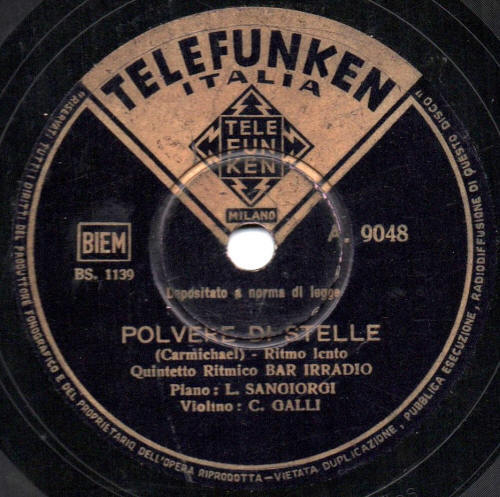 (Carmichael) Al pianoforte LUCIANO SANGIORGI Al violino CESARE GALLI Da supporto 78 giri TELEFUNKEN N.Catalogo A 9048 N.Matrice BS 1139