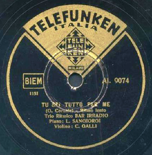 (Cornale) Quartetto ritmico: Al pianoforte LUCIANO SANGIORGI Al violino CESARE GALLI Da supporto 78 giri TELEFUNKEN N.Catalogo A 9074 N.Matrice 1151