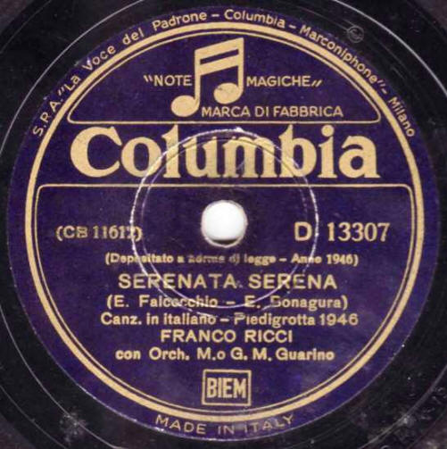 Da supporto 78 giri COLUMBIA N.Catalogo D 13307 N.Matrice CB 11612 inciso il 19 Agosto 1946 |